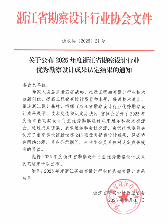 發(fā)布日期:2025.08.26 近日,2025年度浙江省勘察設(shè)計(jì)行業(yè)優(yōu)秀勘察設(shè)計(jì)成果評選結(jié)果正式公布。由我院牽頭設(shè)計(jì)的“奉化江堤防整治工程鄞奉交界段”項(xiàng)目,繼榮獲寧波市優(yōu)秀勘察設(shè)計(jì)獎(jiǎng)之... -