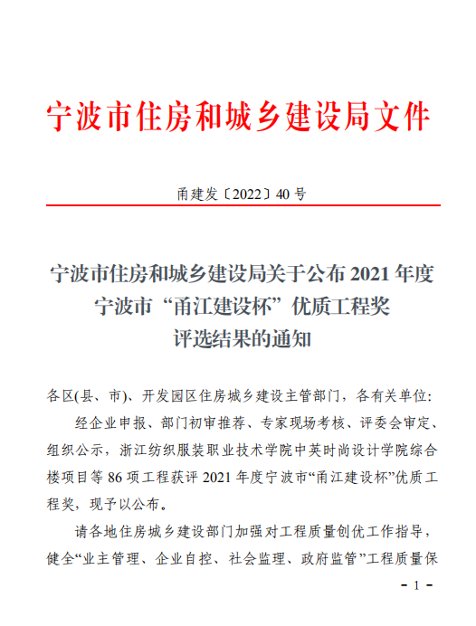 我院兩項(xiàng)工程榮膺2021年度寧波市“甬江建設(shè)杯”優(yōu)質(zhì)工程獎(jiǎng)