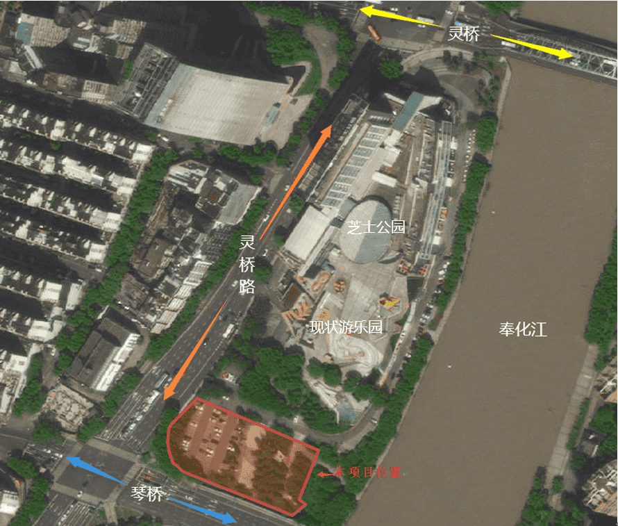 項(xiàng)目地塊位于芝士公園南側(cè),東臨奉化江,南鄰琴橋,西臨靈橋路,北至現(xiàn)狀游樂場。芝士公園位于寧波市海曙區(qū)靈橋路768號,處于寧波核心地段三江口,臨近奉化江,對內(nèi)對外交通十分便利,區(qū)域優(yōu)勢明顯。