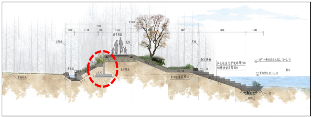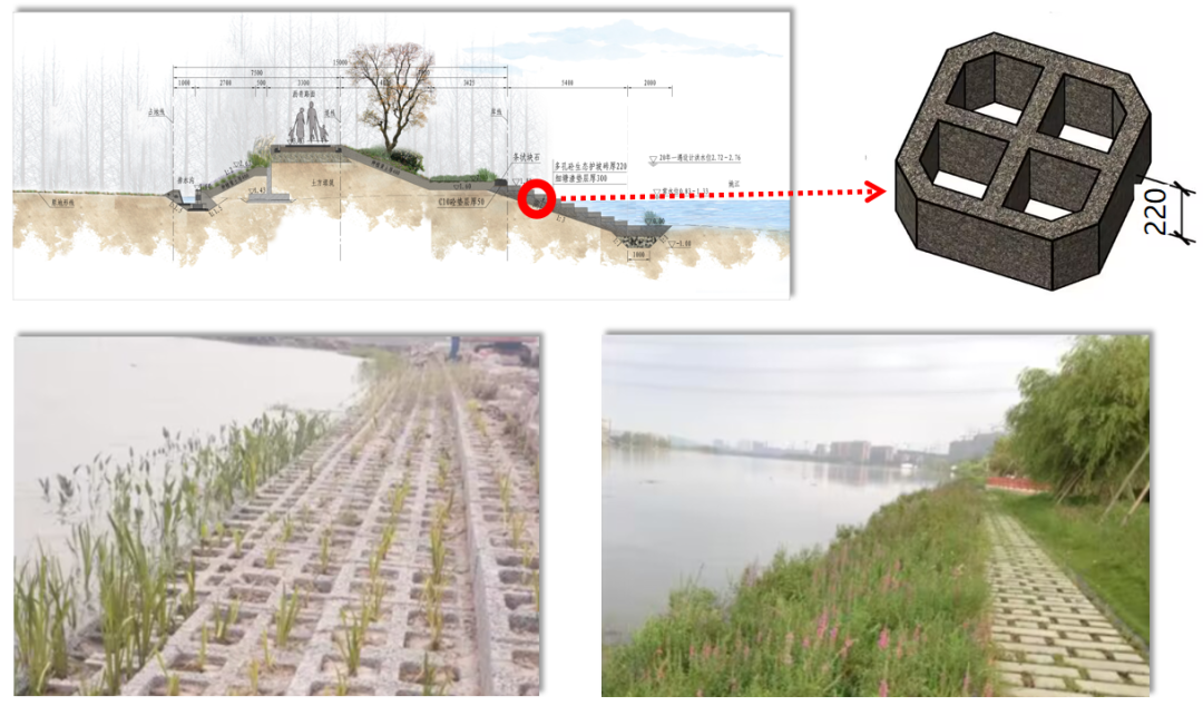 為了保證水體交換同時防御土體掏刷,工程迎水側(cè)護坡采用多孔混凝土生態(tài)護坡磚,不僅防沖固土,也利于水生動植物生長,營造自然、生態(tài)的水岸環(huán)境。